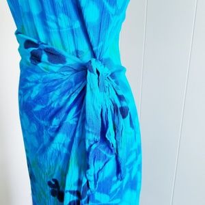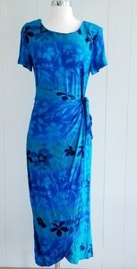 Gorgeous 1980s K.C. Spencer Blue/Green, short sleeve, back zip, front wrap, poly/cotton blend Tropical Dress in excellent condition. Measurements: bust 36"/waist 28"/hips 34"/length 51"