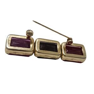 1980s Mod Red Purple Pink Fusia Brooch. Geometric rectangle design is formed by three individual gold trimmed crystals aligned side by side. C clasp closure.