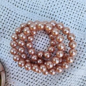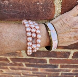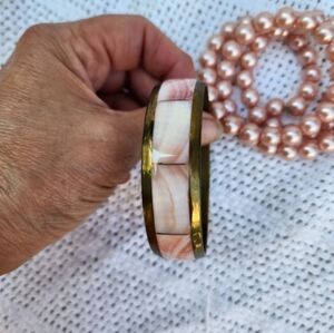 The banglechas original tag as shown on side. Very unusual shell inlay on brass with faux pearls strung on wire