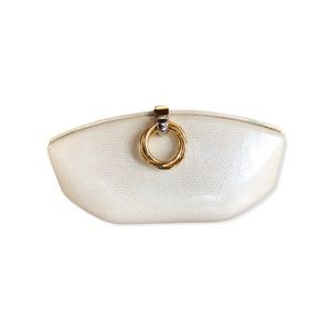 Italian reptile embossed Creamy White Handbag Clutch with hide away gold spiga/wheat chain. Vintage luxury from the 1980’s. One scratch on front and some wear as seen in pictures. Interior is in perfect condition. Exterior has a gold medallion clasp that snaps into place. One main pocket and one small interior pocket. Included with original Rodo cloth protection sack.