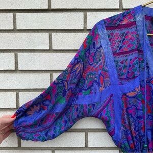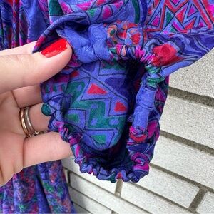 vintage silk dress, Diane Freis original, 80s fashion, abstract print, boho maxi dress, statement sleeve dress, smocked waist, dolman sleeve, purple pink silk, retro glam, vintage collector piece, maximalist style, Y2K inspired, indie sleaze, dopamine dressing, art to wear, funky print, cottagecore, fairycore, festival fashion, Gen Z fashion, eclectic style, handmade feel, secondhand style, vintage revival, slow fashion