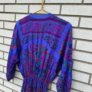 Stunning and rare 1980s Diane Freis original maxi dress crafted from 100% silk in a vibrant abstract purple and pink pattern. Features a flattering smocked elastic waist, v-neckline, and dramatic dolman sleeves with subtle volume. Godet inserts give the skirt beautiful movement and flow. Finished with original tassel tie details at the waist and rich jacquard trim throughout. Shoulder pads have been removed. No size tag, but fits like a modern size Large — please refer to measurements. Great vintage condition with some gentle fading at the shoulders (see final photo).
