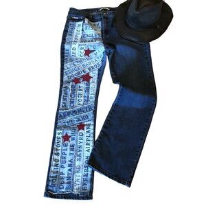 Patch jeans, women's size 12, with 1980s music patchwork, upcycled, handmade vintage retro rock band patches. Unique hippie pants for concerts, etc.