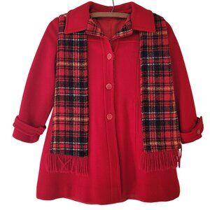 1980s Rothschild Girls Red Hooded Button Pea Coat Plaid Detail w/ Scarf size 6X