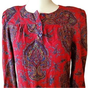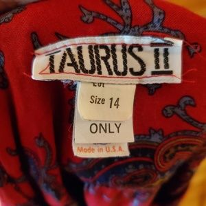 Women's 1980s Taurus II Red Multi-Color, rayon?, shoulder pads, Dress in excellent condition. Measurements: bust 37"/waist 32"/hips 52"/length 43"
