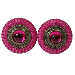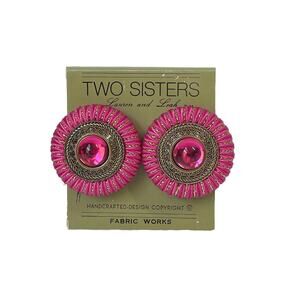 Hot pink fabric with metallic gold thread framing ornate scroll patter silver tone metal with hot pink domed Lucite cabochons clip earrings circa 1990's. Unsigned, the card identifies these as Two Sisters Lauren and Leah ™, each measure 1-1/2 inches in diameter. Although pre-owned, the earrings are in very good condition with small scratches. No rips, tears or loose threads in the fabric. No metal wear. No nicks, chips or cracks in the cabochons. The clips still fit tight. Consider the pictures to be part of the description. Don't hesitate to ask any questions.