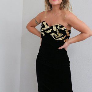 Gorgeous cocktail dress in size small to medium. Strapless style with fitted bodice and sweetheart neckline. Shaped cups with boning in the bust. Dress is fully lined in matching black acetate. Curve hugging sheath shape. The bust is embellished with gold shimmery sequins. Fabric is velvet in black. In excellent condition with no flaws to note.