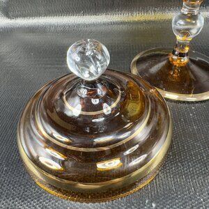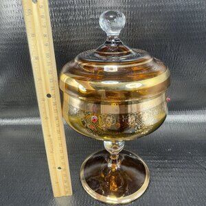 1980s Venetian Art Glass Tall Footed Dish Container Candy Dish Jar Amber Jeweled