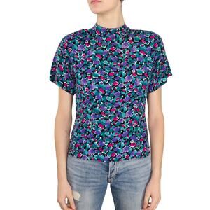 1980s Vintage Blouse. High Neck Floral Blouse with Shoulder Pads. Colorful Floral Pattern with Aqua Green Blue, Purple, and Pink. Puff Shoulder Top, Retro Glam Vintage Top. Short Sleeve Causal Cottage Core Blouse