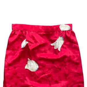 1980s Vintage Bright Red White Tulip Floral Patterned Satin Midi Skirt Size 8