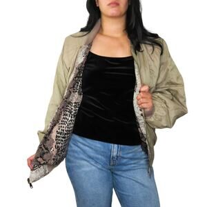 Circa 1980s Vintage Bomber Jacket. Reversible Jacket with Tan Quilted Detail on One Side & Snakeskin Python Print on the Other Side. Retro Casual Windbreaker Style Jacket with Shoulder Pads. The Snake Print Side Is Perfect, Subtle Blemishing Discolor on Tan Side From Age. No Tags, Modern L/XL Based on Fit