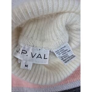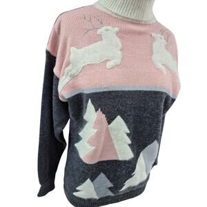 Charming 1980s vintage JP Val sweater in soft pink and grey with a detailed reindeer + tree scene motif. Features a cozy turtleneck, elasticized waist and cuffs, and a wool-angora blend for warmth and softness. A rare example of whimsical winter knitwear from JP Val.