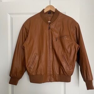 Chic tan leather bomber jacket with ribbed cuffs and hem. Features front pockets and a zippered chest pocket.