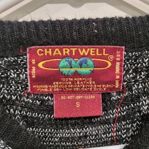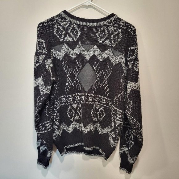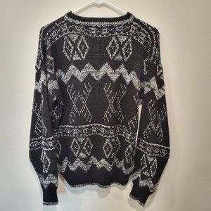 Very good condition 1980s-1990s Men's Sweater from Chartwell. Black and gray geometric/Nordic pattern with black leather patches on front. No holes or stains, size men's small. Please see measurements.