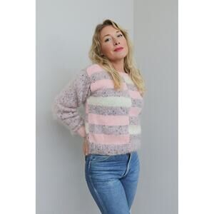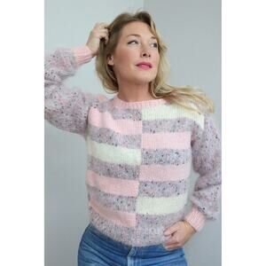 Fuzzy 1980's Slouch fit sweater in women's size xxs to xs. Ribbed knit cuffs and collar. Pretty shades of pastel pink, muted grays, white and multi colored flecks. Oversized, slouchy style fit. Fabric is an acrylic blend with fuzzy mohair on the fleck pattern stripes. In excellent vintage condition with no flaws to note.