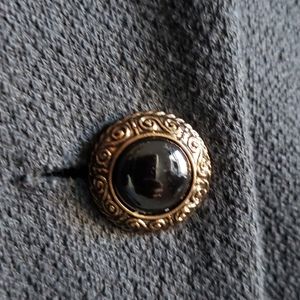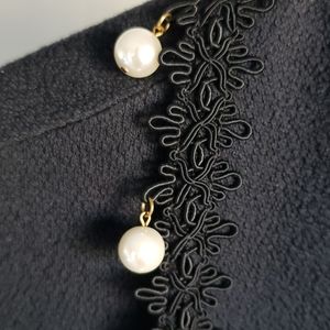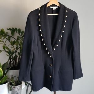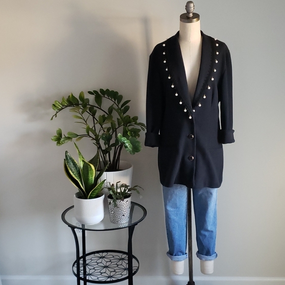 Knit blazer with drop pearl and ribbon stitching detail around lapel.