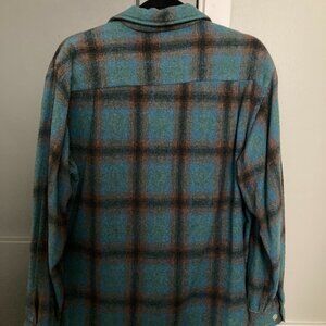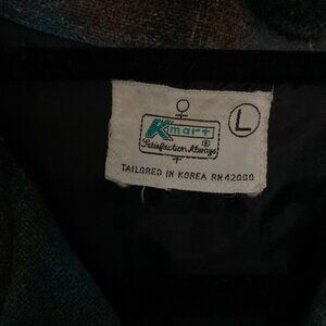 Rare 1980's vintage plaid button-up shirt with cream-colored buttons from K-Mart. Women's size L, Men's size S-M. Colors included are teal, dark green, brown, and navy blue. The material is thicker and is made from 100% wool, so it would also work well as a lightweight jacket. It has two breast pockets on the front. There is a small hole near the left pocket that could be stitched closed. Tailored in Korea.