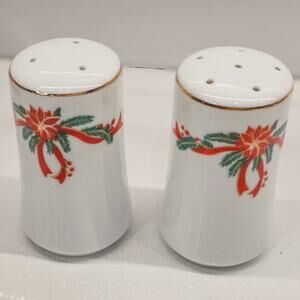 1980's Vintage Poinsettia & Ribbons Fine China Salt & Pepper Shakers, Holiday