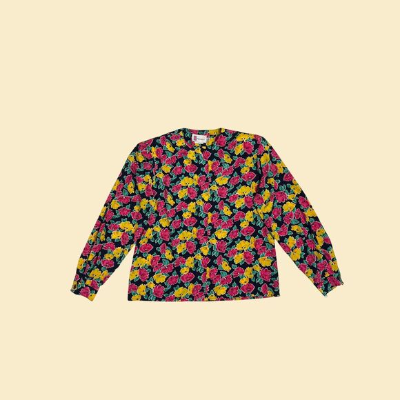 1980s floral blouse by Prophecy, size 10 pink/blue/yellow USA-made long sleeve