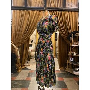 1980s midi dress, black floral rayon, 80s does 40s, 1940s style, medium, scarlet