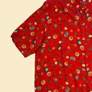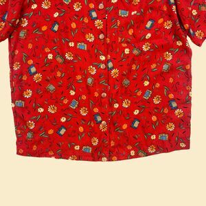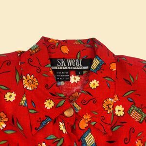 1980s red floral blouse by SK Wear, size S vintage 80s patterned blouse
