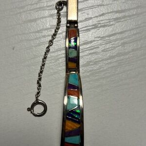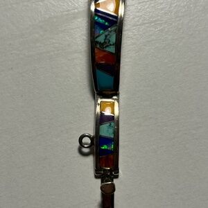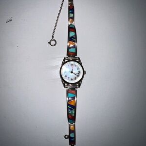 Gemstone Link Watchband featuring multi-gemstones. The jewel smith is Earl Plumber (signed on the underside of the band). The watchband is sterling silver inlaid with Turquoise, Coral, Lapis Lazuli, Opal, and Onyx. The watch face is mother of Pearl (needs a new battery). The piece is in excellent, vintage condition. It is truly a work Of art.