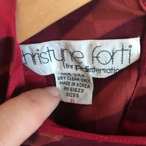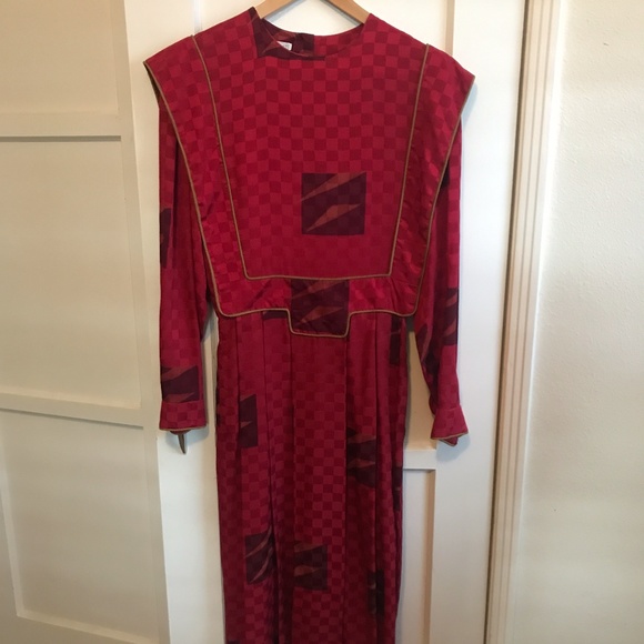Long sleeve maroon print silk dress. Covered buttons up back, front and back bib with pleated skirt.