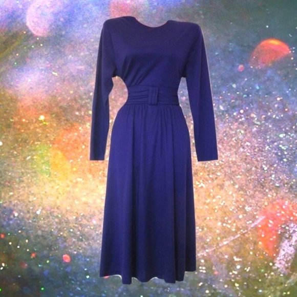 stretch 1980s vintage purple modest midi minimalist swing dress size medium 6 8 skater below the knee minimalist strong shoulder pads long sleeves full skirt knit ruched 80s 1990s 90s vtg swing royal dark