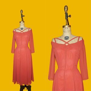 1980s-1990s Rust long sleeve corset back off shoulder dress.