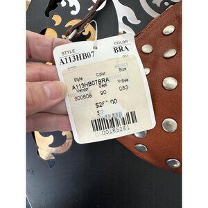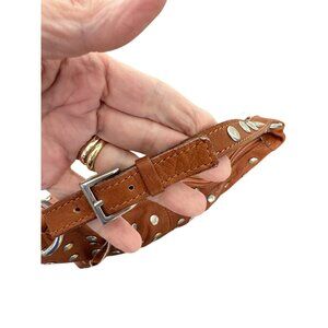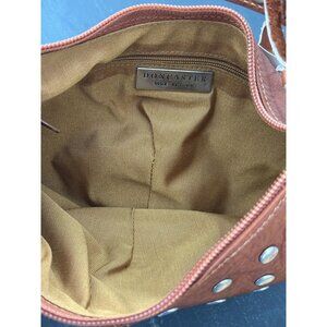This is a gorgeous handbag by the high quality maker Doncaster. It is new, old stock with tags attached (original price was $280.00). The leather is a warm caramel color and of very good quality. It is embellished all over with silver metal studs. It zips on the top and is lined with a copper colored faille fabric that looks like silk. There is a zippered pocket inside. The leather handle has a buckle and three holes so you can adjust the length. Made in Italy. Excellent condition.