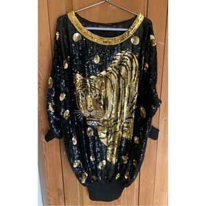 Exquisite hand-sewn gold sequin and beaded tiger on a black silk dolman-style dress. Gold sequin circle accents with stretch ribbed cuffs and hemline. Full silk lining with draped shoulders. Vintage 80s! Perfect condition. Oversized Pullover silhouette. Does not have size tag and have dimensions below: