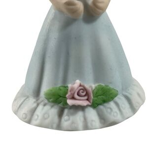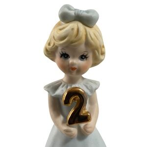 Vintage 1981 Enesco Growing Up Birthday Girls figurine. This collectible porcelain figure features a blonde girl in a light blue dress with a pink rose detail and a gold number “2” in her hands.
