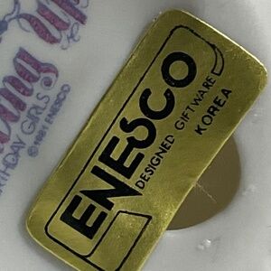 Stamped on the bottom: Growing Up Birthday Girls by Enesco. Original gold foil Enesco sticker still attached. Made in Korea.