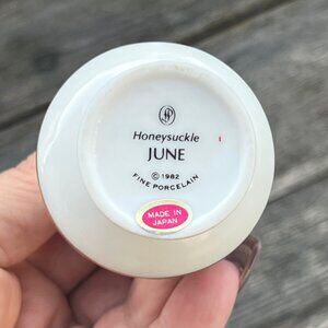 The 1982 Franklin Mint Flowers of the Victorian Year Mini Honey Suckle June Bud Vase is a small, multicolored porcelain vase manufactured in Japan during the 1980s. This vase features an Asian theme and a glazed finish, including the intricate honey suckle June bud pattern.