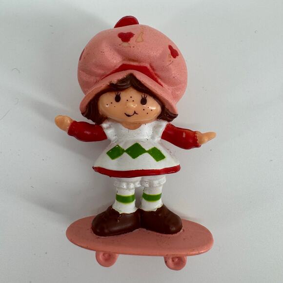 This authentic Strawberry Shortcake on Skateboard PVC mini figure from the 1982 World of Strawberry Shortcake line by Kenner/American Greetings features Strawberry Shortcake balancing on a pastel pink skateboard in her red and white outfit with her classic bonnet.