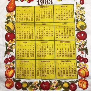 1983 Calendar Tea Towel VIntage Kitchen Red Yellow Fruits Linen Tea Towel