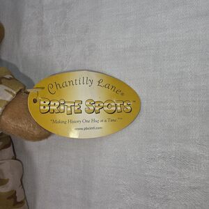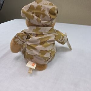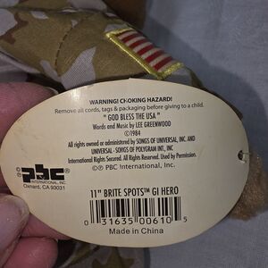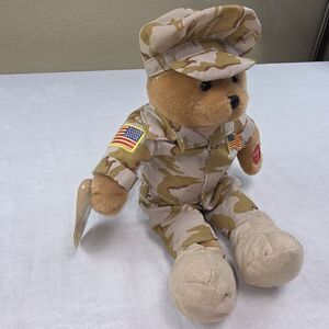 From 1984, this Chantilly Lane American Military Heroes US GI Bear is a 12-inch plush bear that pays tribute to American military heroes. It features a beige color with a black eye and plays the song "God Bless The USA", by Lee Greenwood. Please watch video with sound. Flag pin lights up and flashes. The bear comes with clothing items as part of the American Military Heroes collection, making it a perfect addition for a celebration or patriotic occasion. With its unique theme and character design, this bear is a heartfelt and nostalgic collectible for those who appreciate American military history.