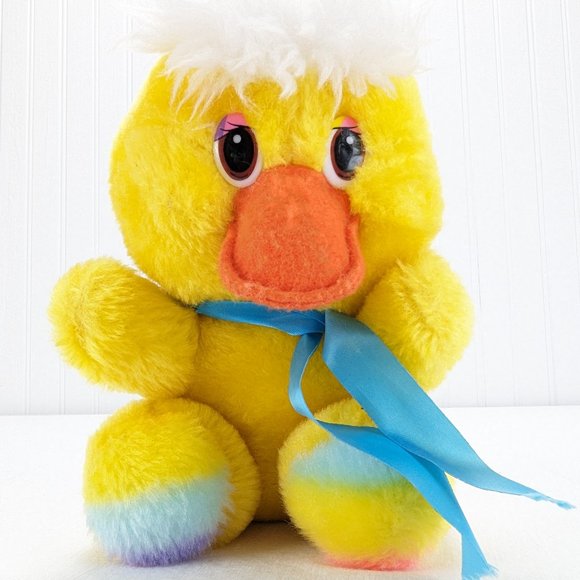 1984 Animal Toy Yellow Duck Plush Stuffed Animal 7" Rainbow Feet Orange Beak