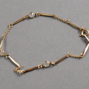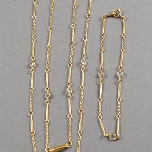 The vintage Simulated Diamond Accent Necklace and Bracelet set was introduced by Avon in the Campaign 19 1984 brochure. The goldtone delicate chain for the necklace and bracelet consists of an intricate design of circles, solid sticks and open chain links and set with channel-set Austrian lead crystal accents.