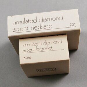 The necklace with 7 Austrian lead crystal accents is 23 inches long with a goldtone barrel clasp. The Simulated Diamond Accent bracelet with 3 Austrian lead crystal accents is 7 ¾ inches in length and has a spring ring clasp.