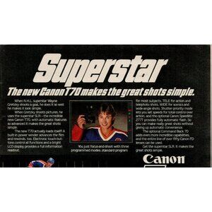 Capture a piece of history with this 1984 Canon T70 camera vintage print ad featuring Wayne Gretzky. Ideal for collectors or photography enthusiasts looking to add unique memorabilia to their collection.