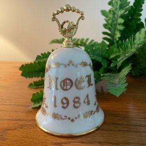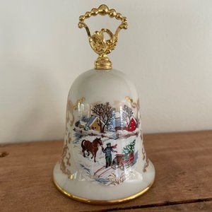 Beautiful Gotham Christmas bell from 1984 from the Currier & Ives collection. Colorful picture shows a boy wrapped for winter weather hitching his horse to a sleigh to deliver a Christmas tree! Vintage.