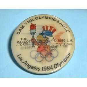 1984 Los Angeles OLYMPICS, 2 Buttons ,Sam The Eagle Mascot & Moving Star logo
