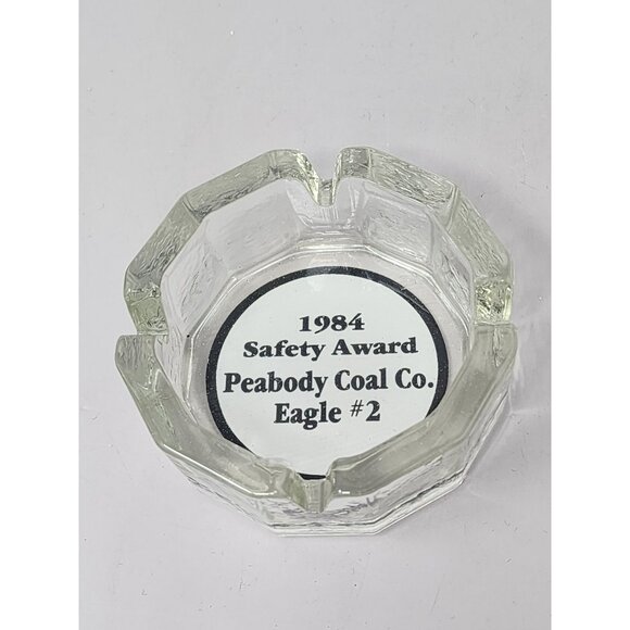 A commemorative 1984 safety award ashtray from Peabody Coal Co. Crafted with clear glass and an octagonal design, it adds historical and collectible value.
