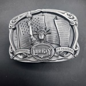 This vintage silver tone belt buckle features lady liberty and measures 3" L x 2.5" W. It was made in the USA in 1985 by the Bergamot Brass Works company.