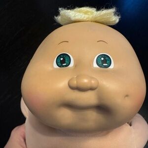 Adorable vintage 1985 Cabbage Patch Kids baby doll from the classic Coleco era, perfect for collectors or anyone feeling nostalgic for the 80s. This original doll features a tiny patch of blonde yarn hair, green eyes, and one dimple on the left cheek, giving it a very sweet baby face. Rarely played with and in great condition.