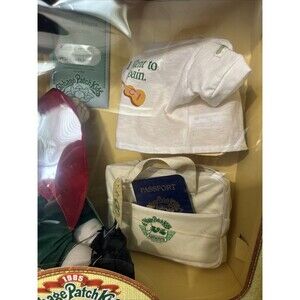 This Cabbage Patch Kids World Traveler playset is a vintage gem from 1985, featuring Peter Sheldon, a boy doll with curly light brown hair and blue eyes. The set includes various accessories, outfits, and documents, such as a passport, airways bag, birth certificate, and doll. The doll's complexion is light, and it is an original, licensed reproduction by Coleco.