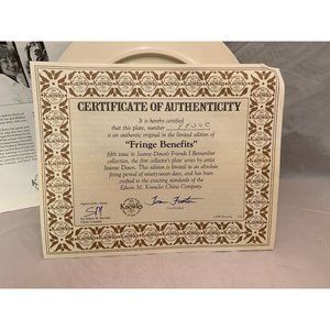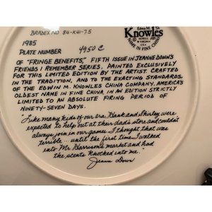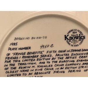 1985 Knowles Plate - Fringe Benefits - Friends I Remember Collection by Jeanne Down - 8.5" w/ Paperwork and Box. Collectible Plate from Edwin M. Knowles and The Bradford Exchange. "Fringe Benefits" is the fifth issue in Jeanne Down's "Friends I Remember" collection. It is from 1985.