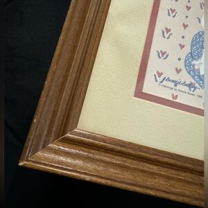 Vintage 1986 Bonnie Butler Framed & Signed Print. Group of stylized figures resembling Raggedy Ann and Andy dolls, along with a sheep, in a pastoral setting with heart-shaped motifs. The artwork features a distinctive folk art or naive art style, characterized by its simplified form and charming, childlike aesthetic. The background features a pattern of small hearts, suggesting a theme of love.