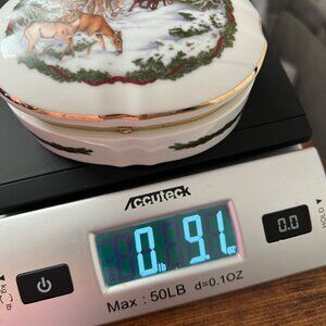 Decorative and functional porcelain trinket box showcasing a serene winter scene with deer, bordered by festive greenery. Gold trim adds an elegant touch.